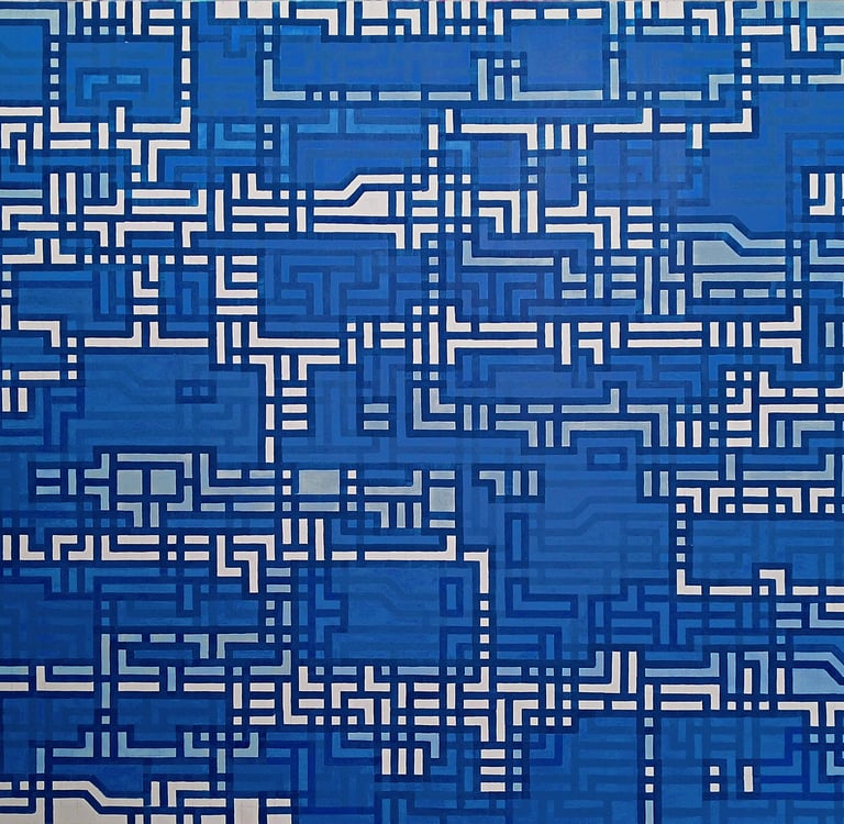 Chaque œuvre commence par la mise en place d’une matrice composée de modules géométriques simples : lignes, angles et fragments répétés organisés selon une logique rigoureuse. Cette première étape crée une architecture visuelle neutre, un espace structuré sans forme centrale.